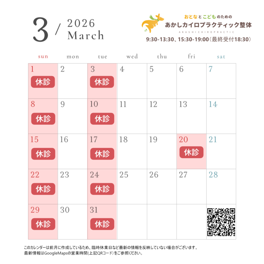 #カイロプラクティック #整体 #腰痛 #肩こり #頭痛 #肩の痛み #首の痛み #坐骨神経痛 #脊柱管狭窄症 #発達障害 #原始反射 #感覚運動エクササイズ #神経発達症 #マッサージではない #BBIT #明石駅 #明石市 #近隣コインパーキング有 #chiropractic